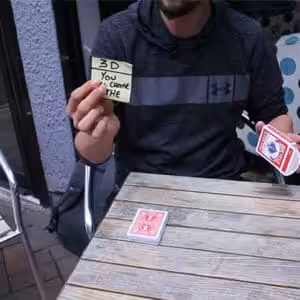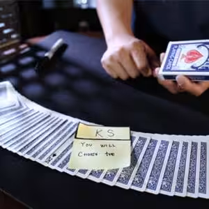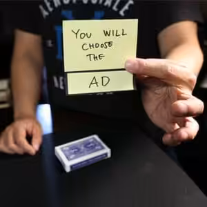 The Post-it Note is stuck on the card box. The deck is removed from the box. You claim that they will select the exact card that is written on the Post-it Note.